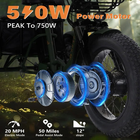Broobey Adult Electric Tricycle 500W Brushless Motor Foldable Large Cargo Basket Li-ion Battery LED Display 7 Speeds Adjustable UTV