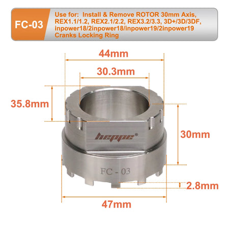 - FC-03 Use for: Install & Remove ROTOR 30mm Axis, REX1.1/1.2, REX2.1/2.2, REX3.2/3.3, 3D+/3D/3DF, inpower18/2inpower18/inpower19/2inpower19 Cranks Locking Ring