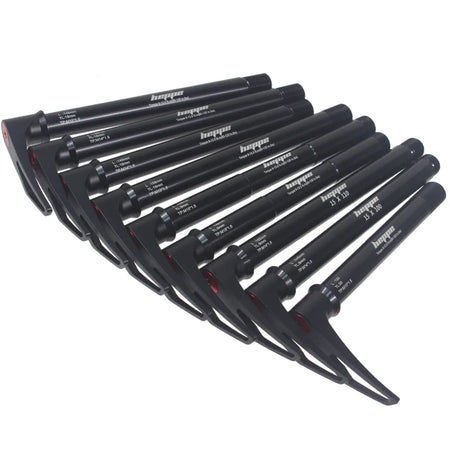 The HEPPE Thru Axle Front Fork Skewer constitutes a precision aluminum component designed for robust performance across both MTB and road cycling disciplines. This quick-release mechanism offers standardized compatibility in 15x100 or 15x110 dimensions, utilizing a precise M15xP1.5 thread pitch for optimal security and rigid wheel retention within the fork structure.