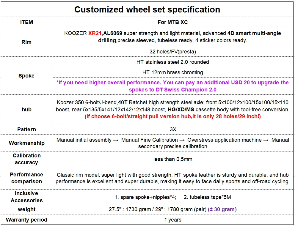 Customized MTB Bicycle Wheel Set Hand-assembled Koozer 350+XR21 Rim for XC / MTB 27.5 29" Boost super light