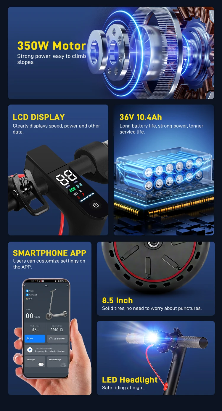 【Safety and Convenience Features】Safety is paramount with the Mankeel MK085 Pro. Equipped with front and rear lights, it ensures you're visible to other road users, especially during nighttime rides. The scooter's dual brake system, featuring an electronic front brake and a rear disc brake, provides reliable stopping power, giving you peace of mind while navigating through urban environments. Its foldable design makes it easy to store and transport, making it a versatile choice for city dwellers and commuters alike. The scooter comes with a 1-year warranty, giving you the assurance of quality and support.