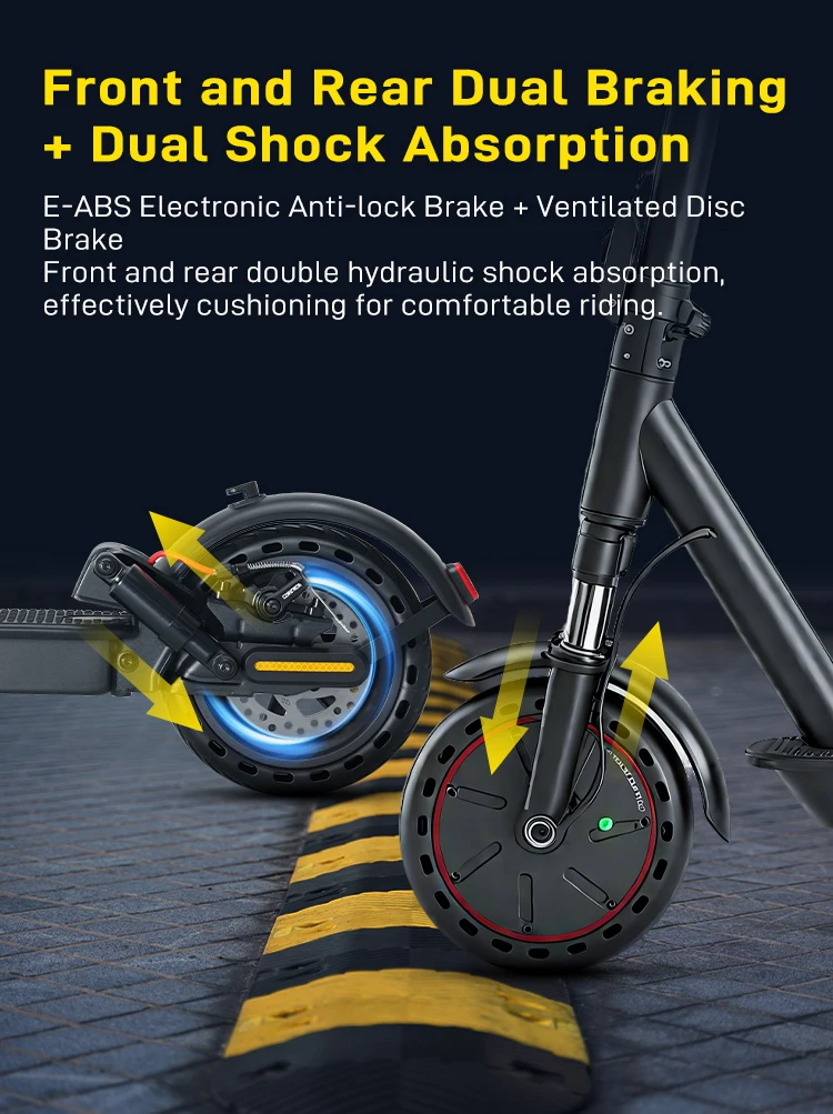 【Advanced Technology and User Convenience】The Mankeel MK085 Pro is more than just a vehicle; it's a smart, connected device. With its smart APP integration, users can control the scooter's speed and lock/unlock it with just a few taps on their smartphones. The LED display on the scooter's handlebar provides real-time information about your speed and battery life, ensuring you're always in the know. The scooter's dual shock absorption system mitigates bumps and vibrations, providing a comfortable ride even on rougher roads.