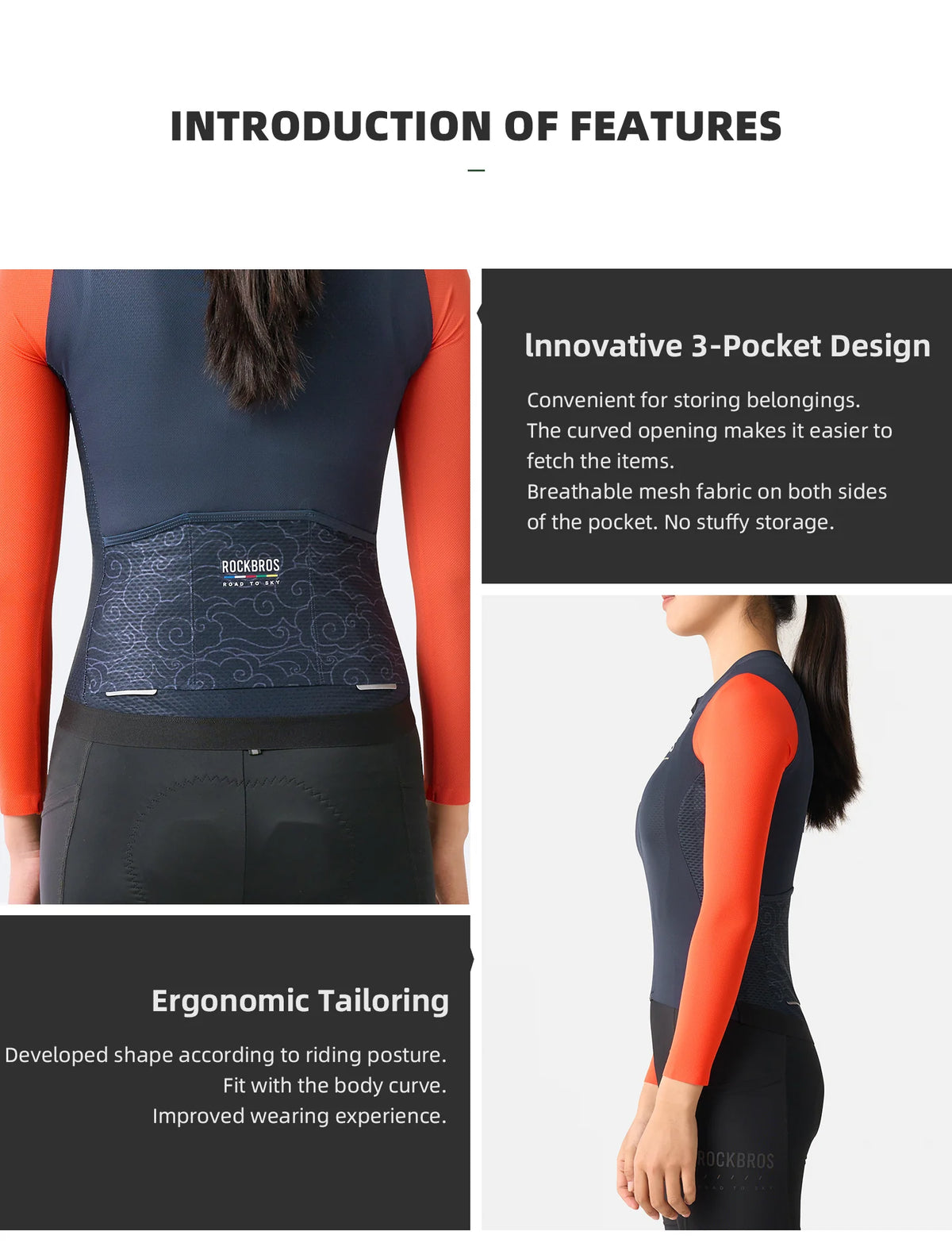 This ROCKBROS ROAD TO SKY Women's Cycling Long-Sleeved Jersey is the perfect choice for any cyclist looking to maximize their performance on the road. Crafted from a lightweight, moisture-wicking fabric, this jersey is designed to keep you cool and dry during your most intense rides. The slim fit cut offers a streamlined silhouette, while the full-length zipper makes for easy on and off. The jersey also features reflective elements on the back for enhanced visibility during nighttime rides, as well as three back pockets for convenient storage of your essentials. Whether you're a serious cyclist or just getting into the sport, the ROCKBROS ROAD TO SKY Women's Cycling Long-Sleeved Jersey is sure to be a great addition to your wardrobe.