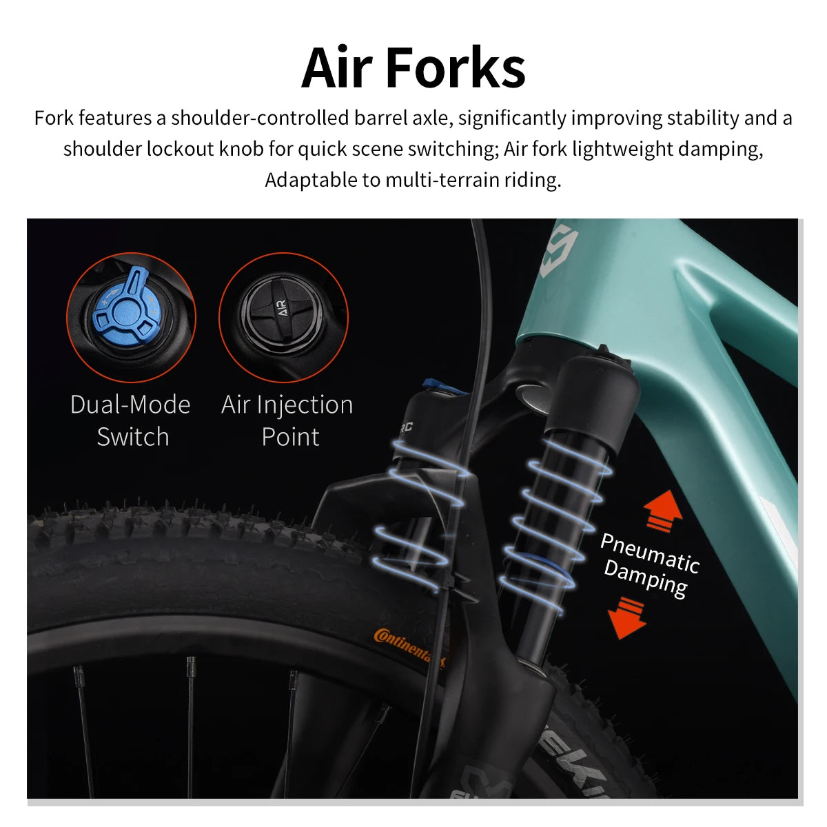 - Front Fork Type: Oil and Gas Fork (Air Resilience/Oil Damping)