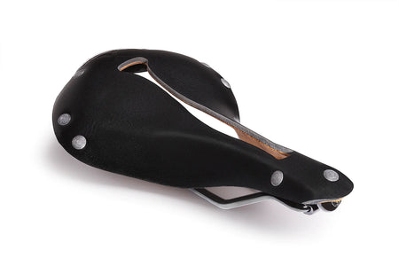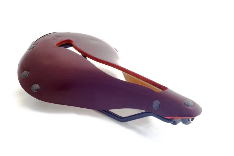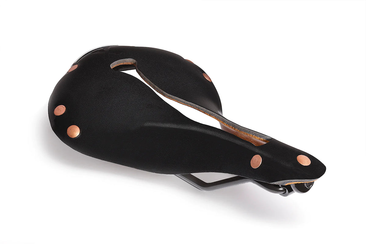 In X1, our supple WaterShed leather top is supported by a stiffer laminate layer glued to the underside. All this supported by exceptionally long Chromoly rails, providing extensive fore/aft adjustment. Comfort is found in the specific shape of our patented slot shape, which moves with you. Our slot eliminates perineal pressure, sit bone pain, and saddle sores.