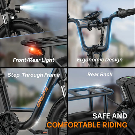 The URLIFE 1000W E20 Electric Bike presents a compelling option for versatile urban and trail riders. It features a powerful 48V 13Ah removable battery, enabling speeds of up to 20mph for efficient travel. Stability and comfort are ensured by its 20''x3" fat tires, while a 7-speed drivetrain and dual disc brakes offer precise control and reliable stopping power. Encased in a durable, multifunctional carbon steel frame, this e-bike is designed for robust performance across diverse terrains.