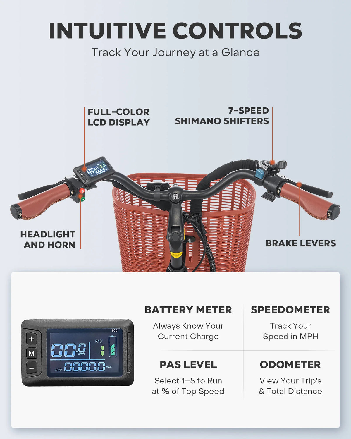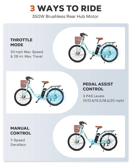 The VIRIBUS Step-Through Electric Bike presents a convenient and efficient mode of transport for adults. This ebike is equipped with a powerful 350W motor and a durable 36V lithium battery, ensuring reliable performance. Riders benefit from a precise Shimano 7-speed pedal assist system and responsive dual disc brakes, enhancing both control and safety. Designed for a diverse user base, the 26-inch model also includes a practical rack and basket, adding significant utility for daily commutes or leisure rides.
