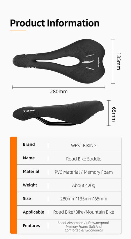 This WEST BIKING Ergonomic Soft Bike Saddle is perfect for both men and women. It features a comfortable memory foam cushion, a hollow breathable design, and is suitable for MTB, road, and BMX bikes. Enjoy a hassle-free and comfortable ride with this reliable bike saddle!