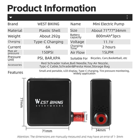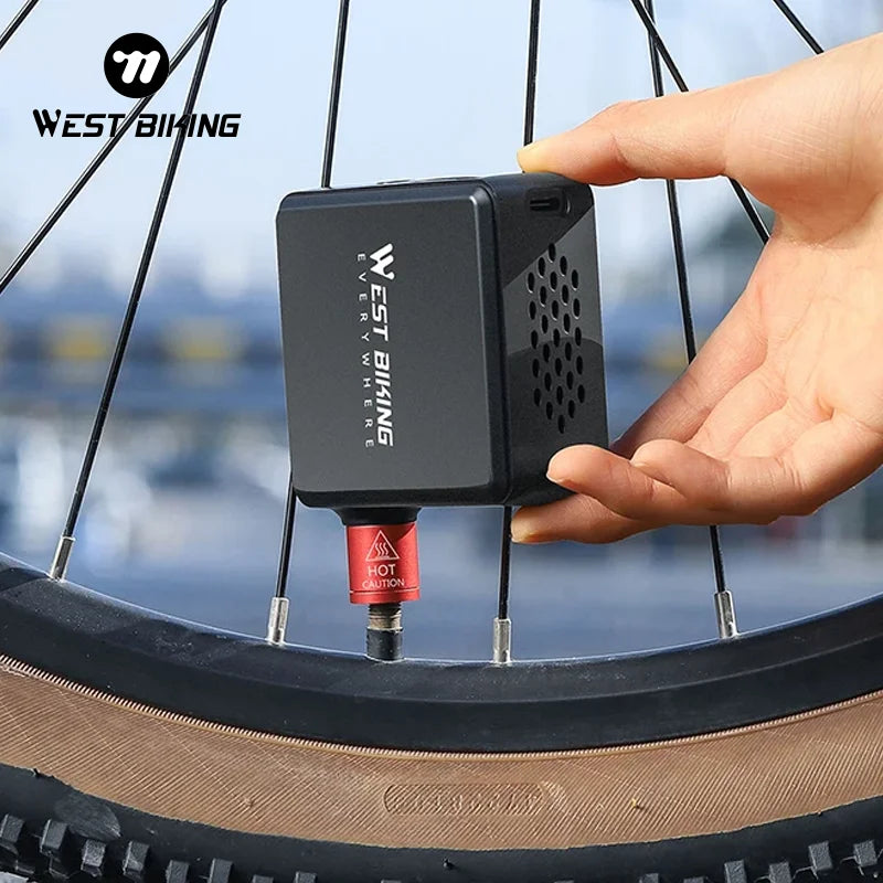 The WEST BIKING Mini Electric Bike Pump is a powerful and compact air compressor designed to make inflating your bike tires a breeze. Capable of reaching an impressive 150 PSI, this portable pump provides ample power for both high-pressure road bike tires and lower-pressure mountain bike tires. It features a clear and easy-to-read digital pressure display, ensuring you can accurately inflate your tires to the recommended PSI without the risk of overinflation. Its compact and lightweight design makes it ideal for carrying on rides or storing in a backpack, while the included valve adapters ensure compatibility with Presta and Schrader valves, making it suitable for a wide range of bikes. Whether you're a casual rider or a seasoned cyclist, the WEST BIKING Mini Electric Bike Pump offers a convenient and reliable solution for on-the-go tire inflation, taking the effort out of maintaining your bike's optimal tire pressure.