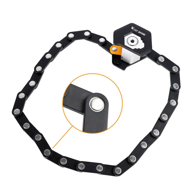 The WEST BIKING Portable Folding Bicycle Lock represents a robust solution for securing valuable two-wheeled conveyances. Crafted from durable alloy steel, its resilient construction provides formidable resistance against theft attempts, ensuring peace of mind for owners. This anti-theft safety lock is uniquely designed for versatile application, making it an ideal protective accessory for mountain bikes, road bikes, electric bikes, and even motorcycles, reflecting a commitment to comprehensive security.