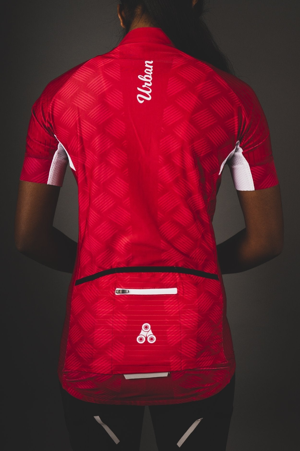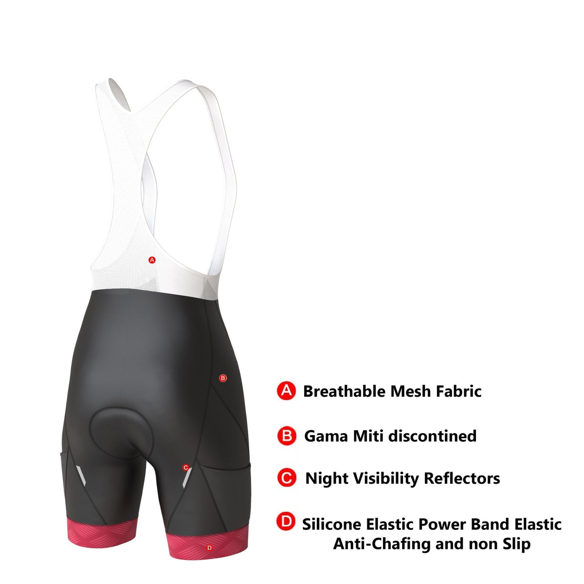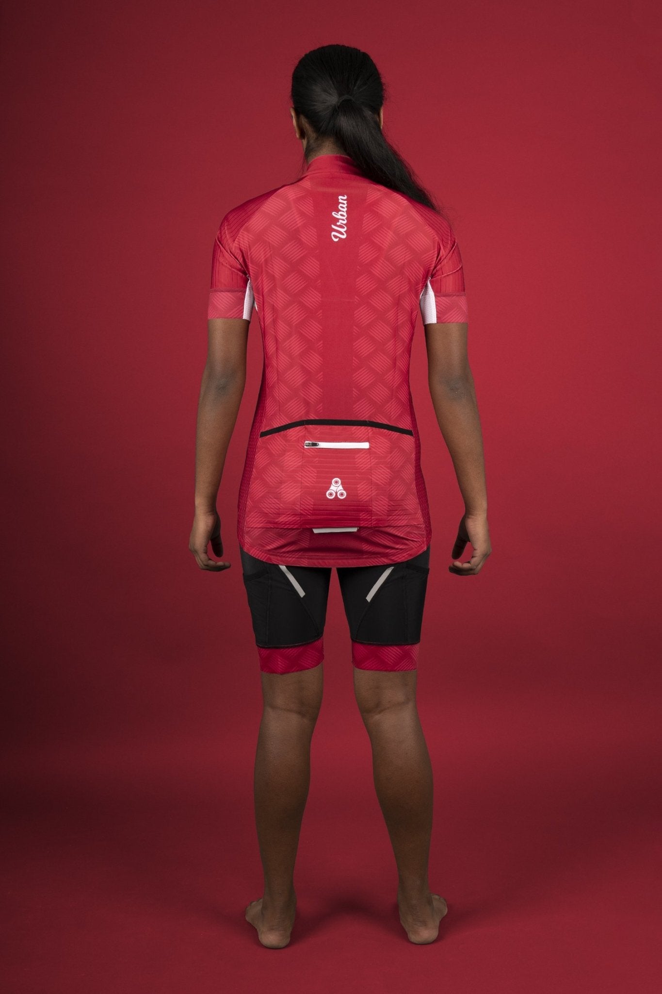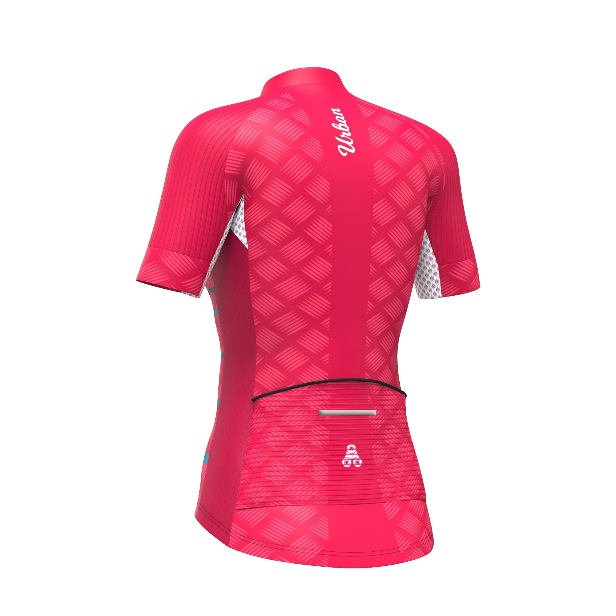 Designed in the U.S.A. for our pro female athletes seeking comfort and performance. Our engineers obsess over anatomic fit, aerodynamics, safety, and fabric innovation so you can focus on your ride. These lightweight and breathable jerseys and bib shorts keep you feeling comfortable and dry. The Urban printed elastic grippers hold the jersey and short edges in place and from riding up. The longer shaped back is well suited for cycling riding position. The Jersey is a full length zipper with 3 rear pockets plus an extra zipped pocket for your valuables. Reflectors on both the back and thighs were added for dusk and night riding. BONUS: These bib shorts have a mobile phone pocket!